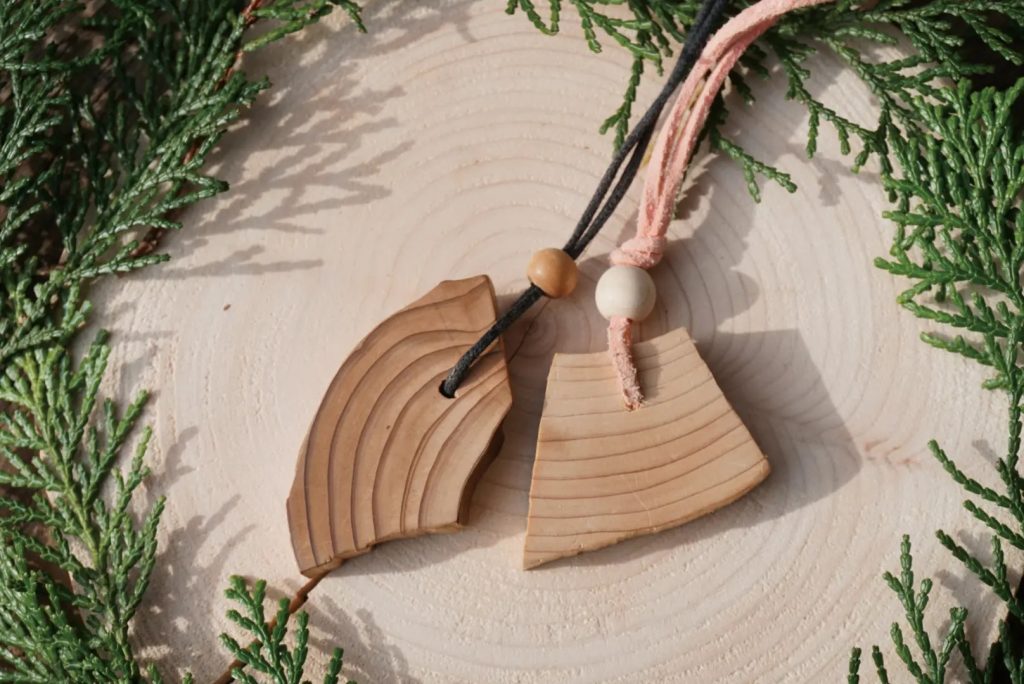 丸太を切り出してつくるパズルや、木のかけらを磨いてアクセサリ