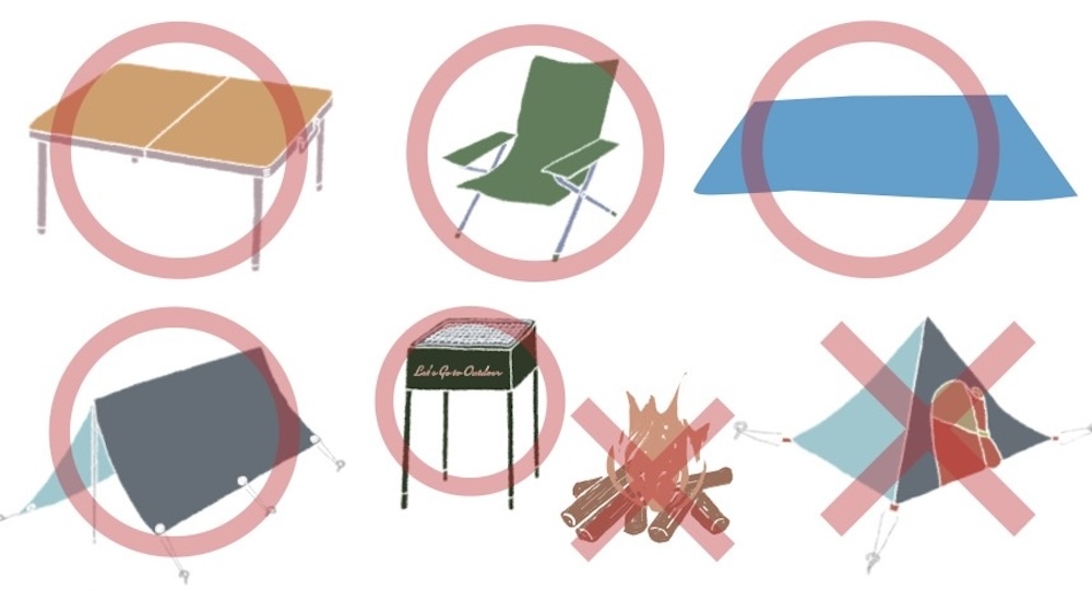 メインステージのGO OUT STAGE前に位置する「ピクニックエリア」では、イスやテーブル、レジャーシートは勿論、タープ、シェードも張ることができます。周りの方と譲り合いながらご利用ください。BBQなどもOKです!!(炎がすごい、煙がすごいなどの危険や、他のお客様のご迷惑になる際はスタッフにより中止していただく場合もあります)。焚き火は禁止です。