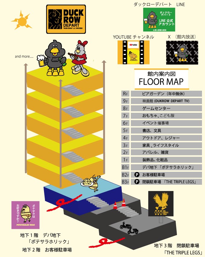 地下一階にはポテトサラダ愛を炸裂させる「ポテサラホリック」、地下三階にはバイクとライフスタイルをつなぐ「ザ・トリプルレッグス」が広がり、DUCKROW DEPARTは、キャラクター、カルチャー、アート、ビール、そして暮らしを楽しむモノがごちゃ混ぜになった遊び場です。