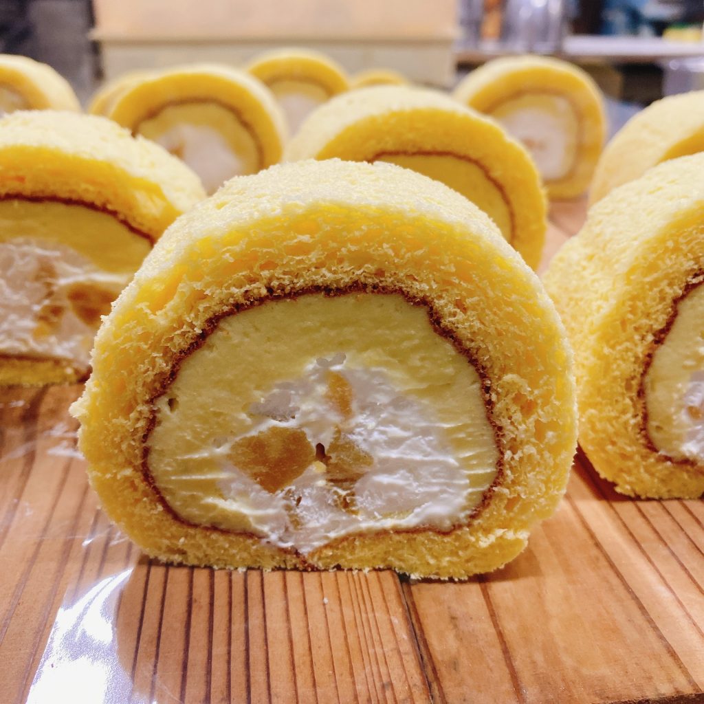 富士宮産紅はるかの焼芋ロール:ふわふわのスポンジの中にさつまいもクリーム、生クリーム、焼芋の三重構成のロールケーキです。