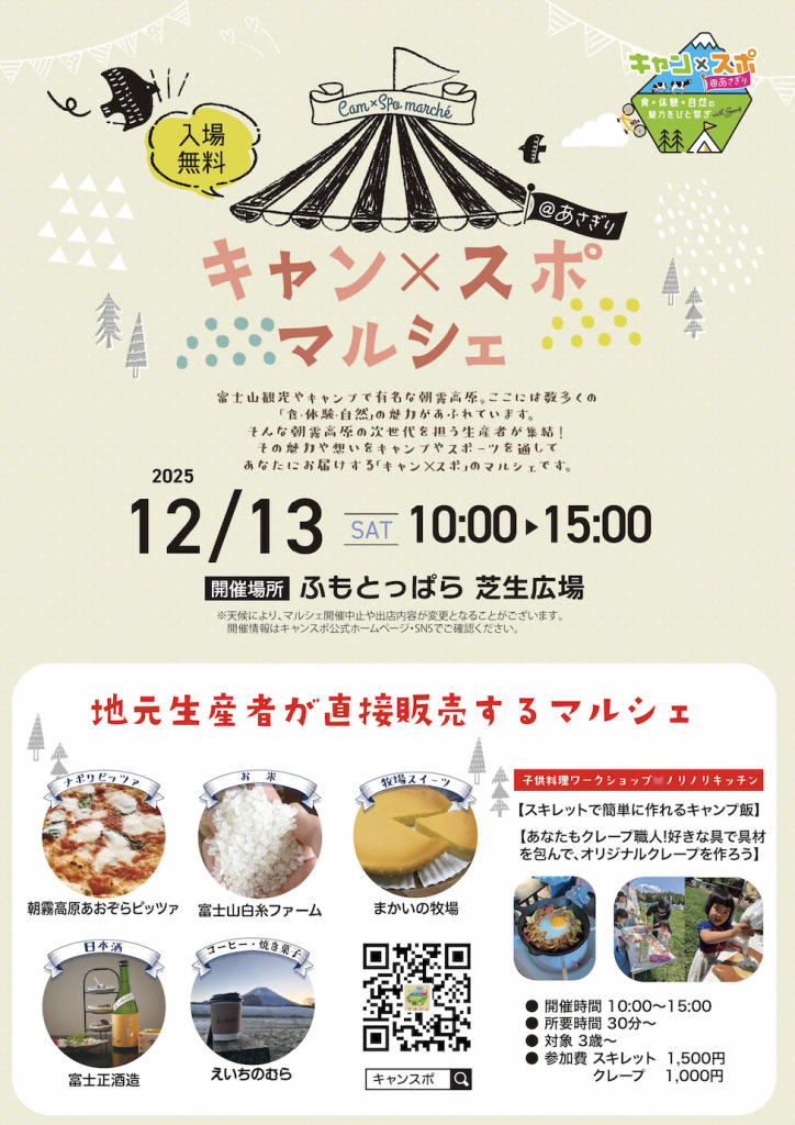 地元「朝霧高原」の生産者がこだわりの食材・実演販売をする「キャンスポ@あさぎり」 マルシェがふもとっぱら内で開催されます♪ 毎月第2土曜日に朝霧高原内で開催するマルシェのふもとっぱら開催です。 詳しくは https://camspo.comGO OUT冬も開催されています。せっかくのふもとっぱらでのキャンプ。 地元食材、グルメをお楽しみください♪今回は子供向けの料理教室もありますので、ぜひご参加ください(先着受付、当日参加も可能)。 【日時・場所】12/13(土) 10:00-15:00ふもとっぱら金山テラス横芝生広場【出店者一覧】 6店舗出店・朝霧高原あおぞらピッツァ・えいちのむらパン、焼き菓子、ドリップコーヒー・富士山白糸ファームおにぎり、スープ・富士正酒造日本酒、焼酎、ゆず酒・まかいの牧場牧場スイーツ・子供料理ワークショップ ♡ノリノリキッチン【スキレットで簡単に作れるキャンプ飯】&【あなたもクレープ職人!好きな具で具材を包んで、 オリジナルクレープを作ろう】 開催時間:10時〜15時所要時間:30分~対象:3歳~参加費:スキレット 1,500円、クレープ 1,000円